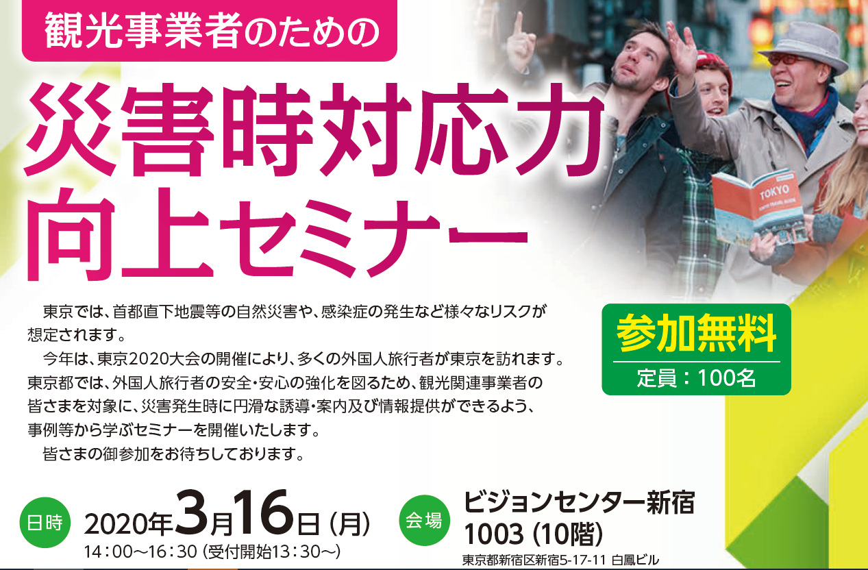 今年は、東京2020大会の開催により、多くの外国人旅行者が東京を訪れます。東京都では、外国人旅行者の安全・安心の強化を図るため、観光関連事業者の皆さまを対象に、災害発生時に円滑な誘導・案内及び情報提供ができるよう、事例等から学ぶセミナーを開催いたします。皆さまの御参加をお待ちしております。