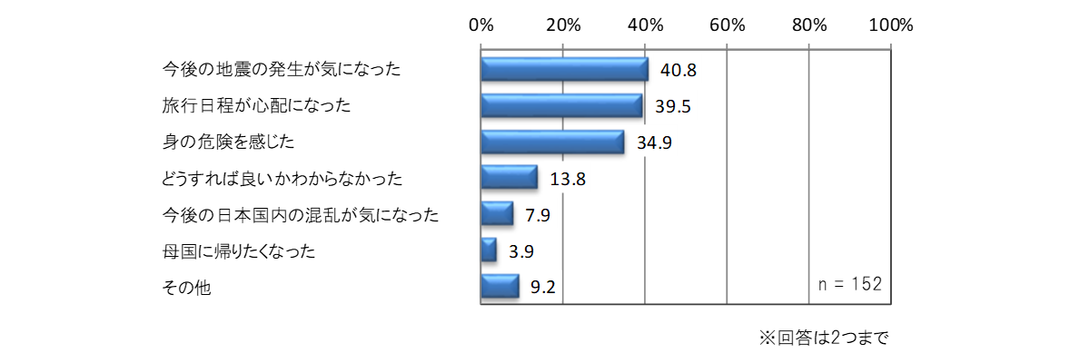・地震発生時に思ったことについては、「今後の地震の発生が気になった」が40.8%、「旅行日程が心配になった」が39.5%で共に約4割、次いで「身の危険を感じた」が34.9%となっている。