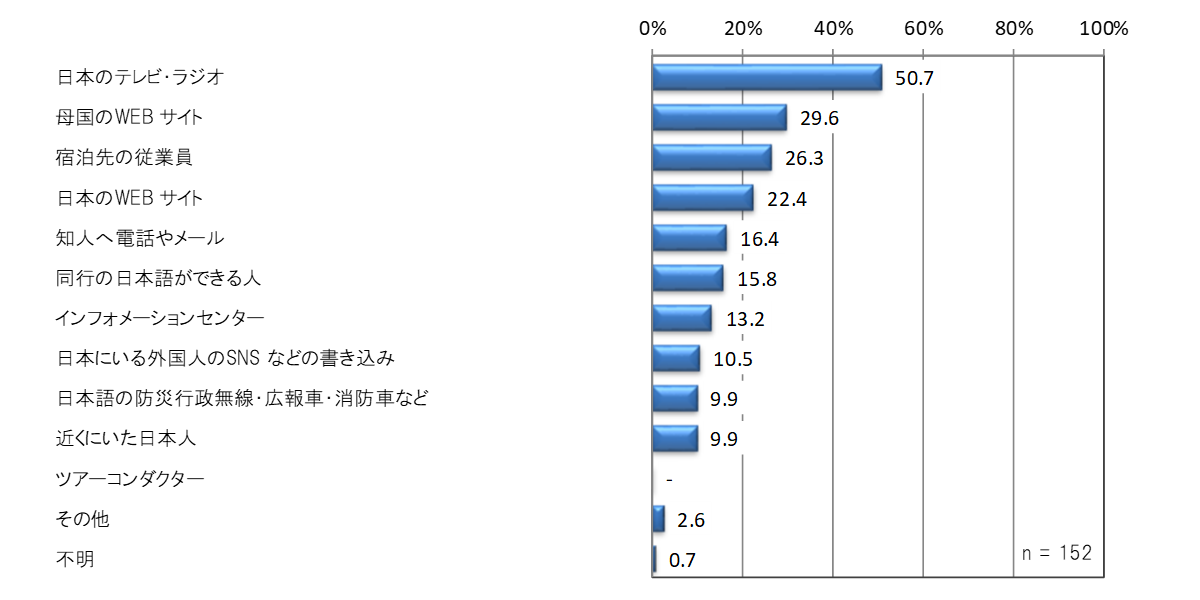 ・以下、「母国のWEBサイト」(29.6%)、「宿泊先の従業員」(26.3%)、「日本のWEBサイト」(22.4%)、「知人へ電話やメール」(16.4%)、「同行の日本語ができる人」(15.8%)等が続いており、即時性や情報量の多さからテレビ・ラジオを利用する一方で、訪日外国人旅行者として言葉が理解しやすい情報源・方法も併用しようとした様子がうかがえる。