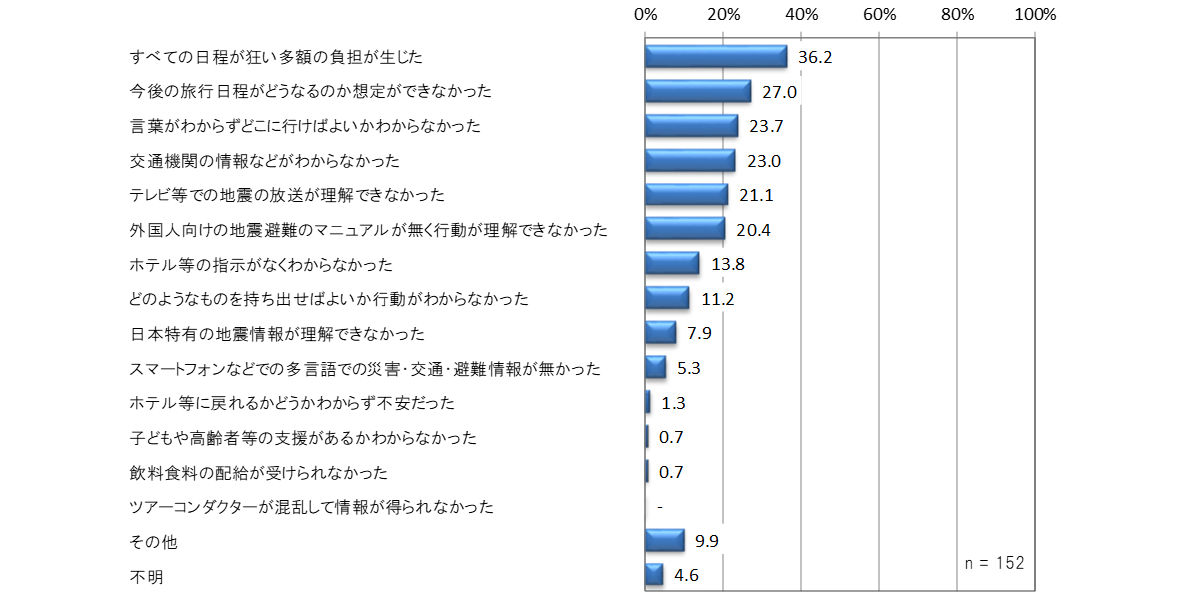 ・地震発生時に困ったことは「すべての日程が狂い多額の負担が生じた」(36.2%)が最も多かった。また、地震による不測の状況と情報不足から、「今後の旅行日程がどうなるのか想定ができなかった」(27.0%)との回答が多かった。