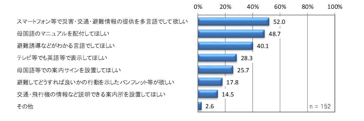 ・旅行行動を定めるための情報収集においても、「言葉がわからずどこに行けばよいかわからなかった」(23.7%)、「交通機関の情報などがわからなかった」(23.0%)、「テレビ等での地震の放送が理解できなかった」(21.1%)、「外国人向けの地震避難のマニュアルが無く行動が理解できなかった」(20.4%)といった言語の課題が多く、災害時の情報提供における多言語対応の重要性が示されている。