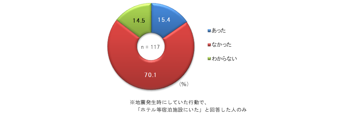 ・宿泊施設到着時の避難についての事前説明の有無については、「なかった」が70.1%、「あった」が15.4%であった。