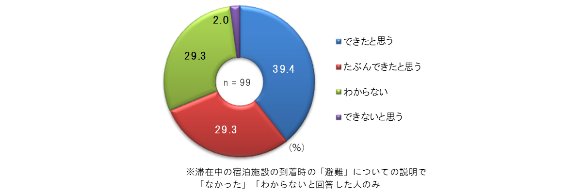 ・宿泊施設到着時の避難の事前説明が「なかった」「わからない」と答えた人のうち、39.4%が事前の説明があればスムーズに行動「できたと思う」と回答し、「たぶんできたと思う」(29.3%)を合わせると7割近くの旅行者が、事前説明の必要性を感じているようである。