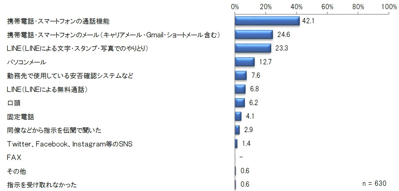 ・地震発生当日の勤務先からの出勤に関する指示の受け取り手段は、「携帯電話・スマートフォンの通話機能」(42.1%)、「携帯電話・スマートフォンのメール(キャリアメール・Gmail・ショートメール含む)」(24.6%)、「LINE(LINEによる文字・スタンプ・写真でのやりとり)」(23.3%)が高くなっており、勤務先からの出勤に関する指示を携帯電話・スマートフォンを通じて受け取っていた人が多い。