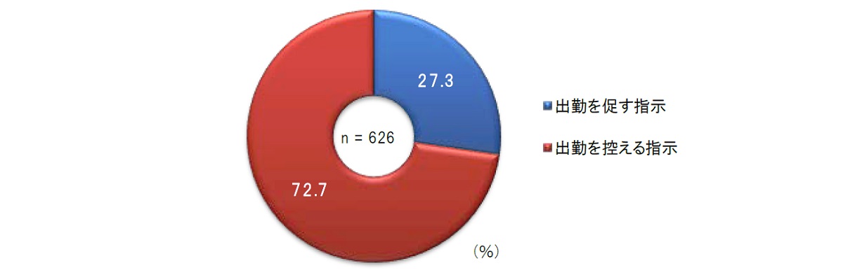・地震発生当日に受け取った勤務先からの出勤に関する指示のうち、「出勤を促す指示」は3割弱、「出勤を控える指示」が7割以上となっている。