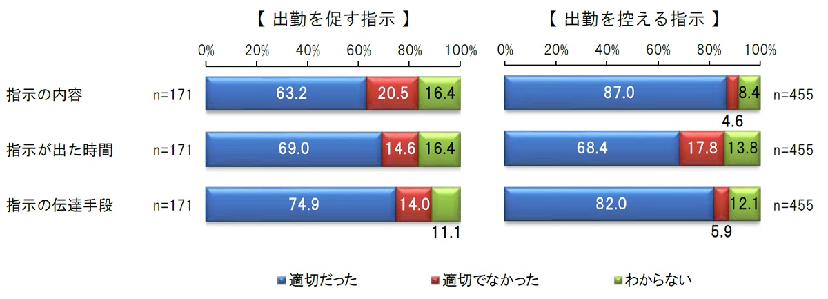 ・特に、【出勤を控える指示】については、指示の内容について9割近い人が「適切だった」と回答しており、肯定的に受けとめられている。