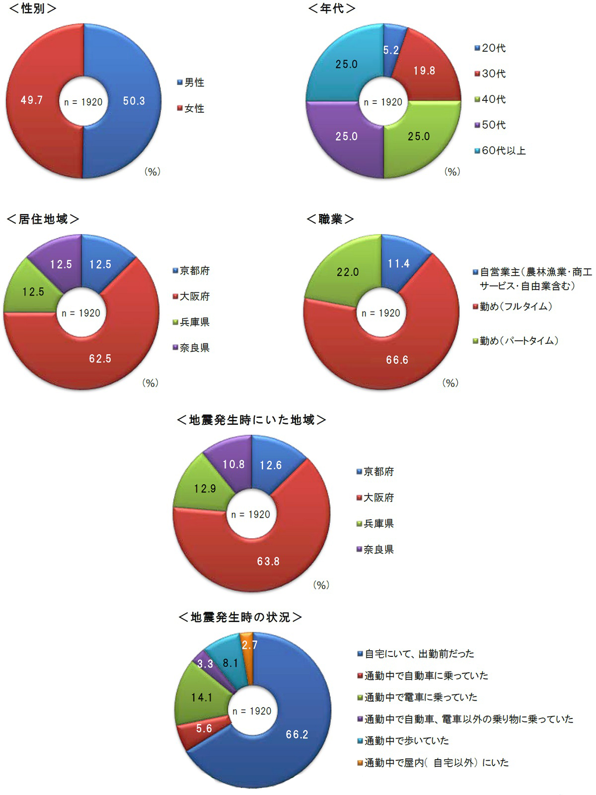 2018年6月18日7時58分頃に発生した「大阪府北部地震」(最大震度6弱)について、地震当日の近畿圏(京都府、大阪府、兵庫県、奈良県)における出勤の判断や勤務先からの出勤に関する指示などの状況を把握することで、今後の「出勤困難者対策」のあり方を探ることを目的として、調査を実施しました。
