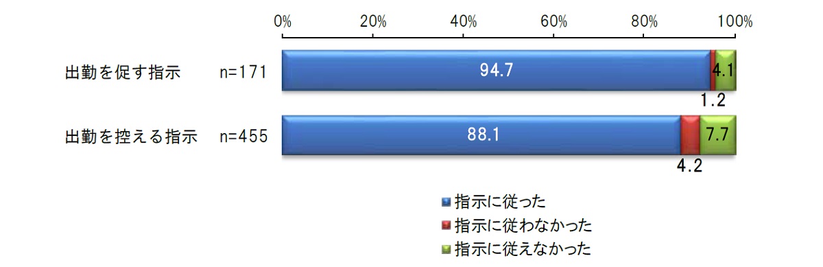 ・出勤を促す指示、出勤を控える指示ともに、9割前後の人は、地震発生当日に受け取った勤務先からの出勤に関する指示に従ったと回答しており、過去の風水害時とは異なる結果となった。