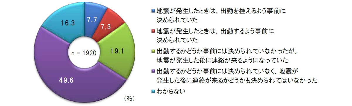 ・一方、「出勤するかどうか事前には決められていなく、地震が発生した後に連絡が来るかどうかも決められていなかった」が49.6%と、地震災害時の出勤に関するルールや連絡について整備されていない勤務先が半数を占める。
