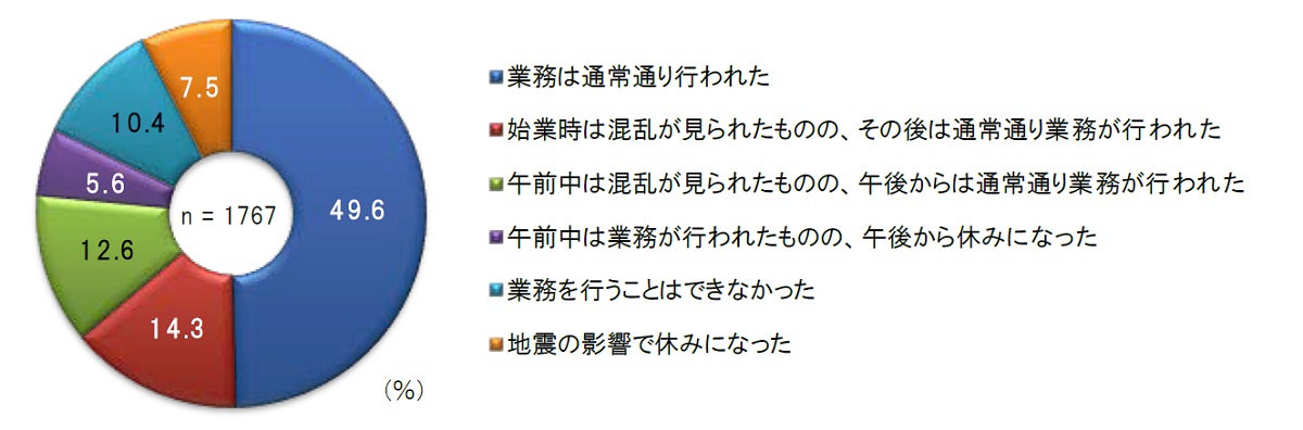 ・地震発生当日、「自主的に休んだので、業務の状況はわからなかった」人を除いた1767人のうち、地震発生後に「業務は通常通り行われた」人は1767人中877人(49.6%)となっており、逆に、それ以外の890人(50.4%)は、勤務先で混乱が見られたり休みになったなど業務に支障が出たと回答している。