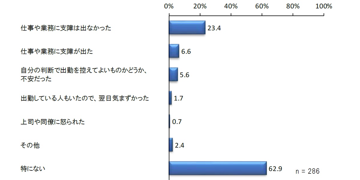 ・地震発生当日勤務先が「地震の影響で休みになった」または「自主的に休んだので、業務の状況はわからなかった」286人に、出勤しなかったことや勤務先が地震の影響で休みになったことによる影響を尋ねると、「仕事や業務に支障が出た」人は6.6%にとどまった。