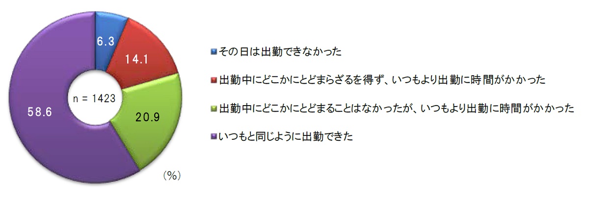 ・地震発生当日に勤務先に向かった1423人のうち、「いつもと同じように出勤できた」人はおよそ6割。