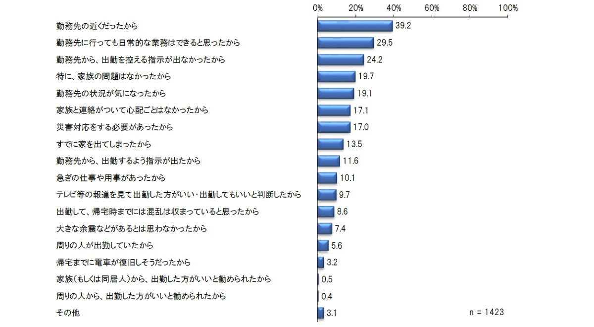 ・地震発生当日、地震発生後に勤務先に向かった人の出勤しようとした理由は、「勤務先の近くだったから」(39.2%)、「勤務先に行っても日常的な業務はできると思ったから」(29.5%)、「勤務先から、出勤を控える指示が出なかったから」(24.2%)などが高くなっている。