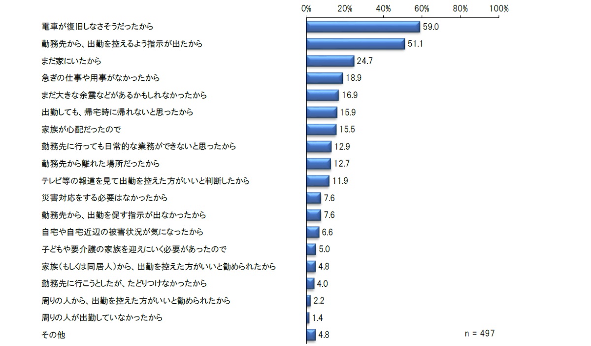 ・地震発生当日、出勤をしなかった理由は「電車が復旧しなさそうだったから」(59.0%)と「勤務先から、出勤を控えるよう指示が出たから」(51.1%)が5割以上と高い。