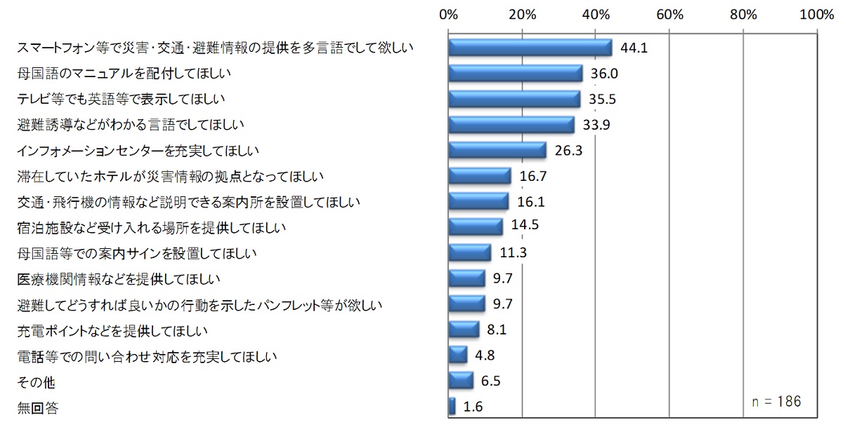 ・災害発生時に希望する対応は「スマートフォン等で災害・交通・避難情報の提供を多言語でしてほしい」が44.1%、「母国語のマニュアルを配付してほしい」が36.0%、「テレビ等でも英語等で表示してほしい」が35.5%、「避難誘導などわかる言語でしてほしい」が33.9%と、WEB・紙・テレビ・現地でのアナウンス等、様々な媒体・シーンで多言語での情報提供が求められている。