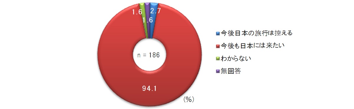 ・今回の災害を経験した上で今後の訪日意向をたずねたところ、「今後も日本には来たい」が94.1%と高い傾向を示した。