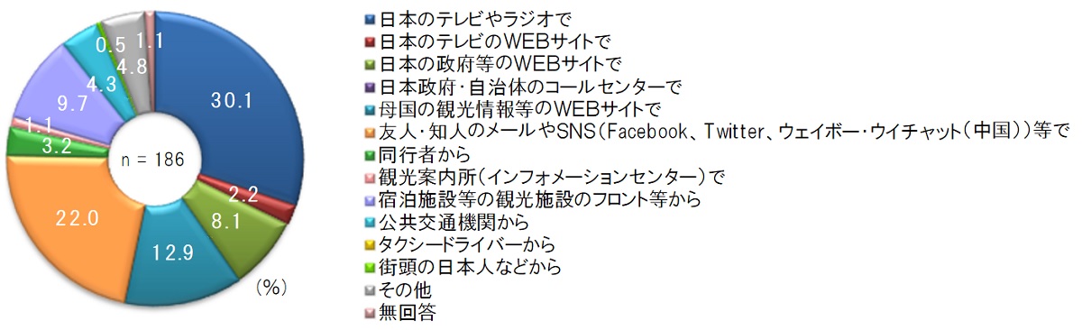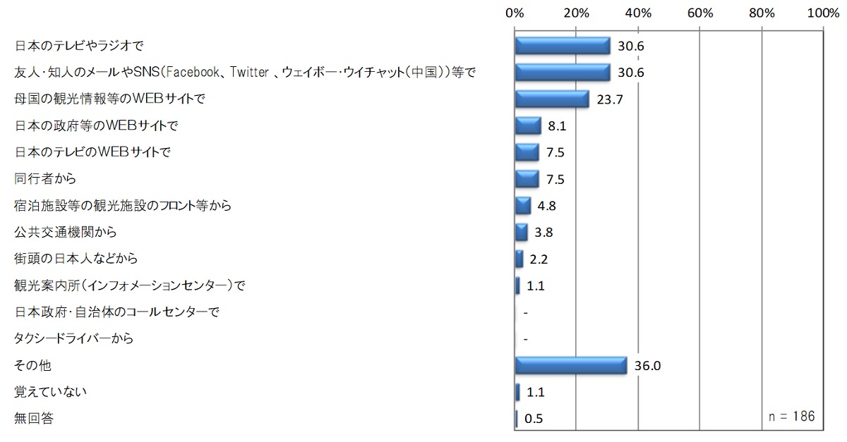 ・台風が来ることを知った情報媒体は、「日本のテレビやラジオで」「友人・知人のメールやSNS等で」が共に30.6%、「母国の観光情報等のWEBサイトで」が23.7%と続く、「その他」の回答の中には「母国のTV」等、母国出国前に情報を得ている様子もうかがえた。