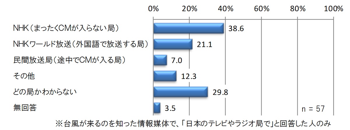 ・「日本のテレビやラジオ局」で台風の情報を得た方に、具体的な放送局を聞いたところ、「NHK」が38.6%、「NHKワールド放送」が21.1%と続く。29.8%は「どの局かわからない」という回答だった。