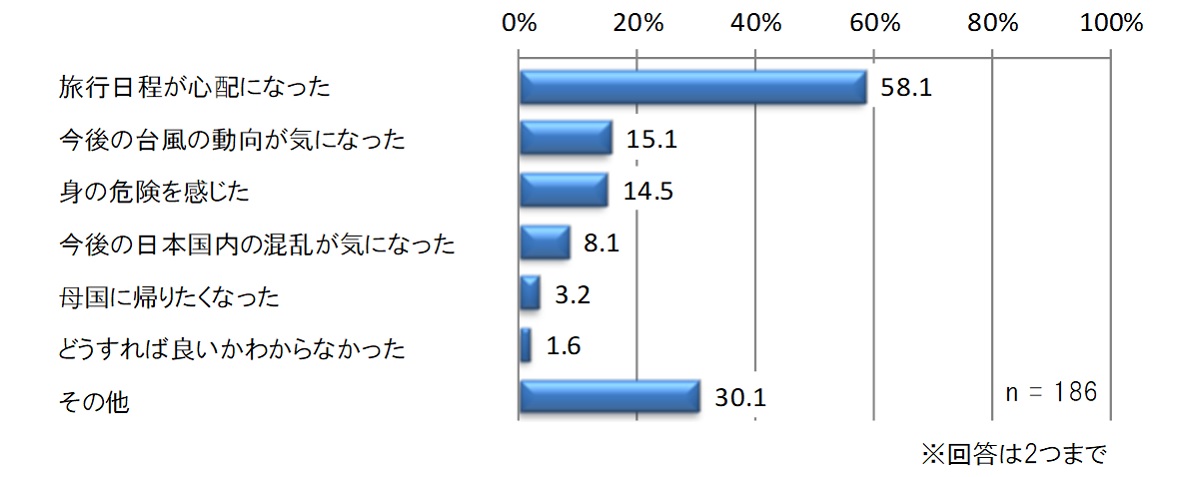 ・台風発生時に思ったことについては、「旅行日程が心配になった」が58.1%と半数以上を占めた。台風の影響による公共交通機関等の乱れによって、予定していた旅行日程通りに行動できるか気になっていたようだ。