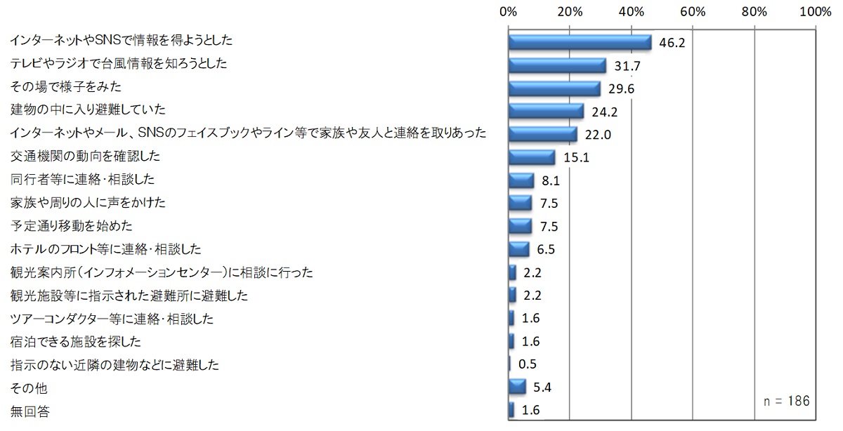 ・台風接近時の行動は、「インターネットやSNSで情報を得ようとした」が46.2%、「テレビやラジオで台風情報を知ろうとした」が31.7%と情報収集が上位を占めた。他にも「その場で様子をみた」が29.6%、「建物の中に入り避難していた」が24.2%等の避難行動もみられた。