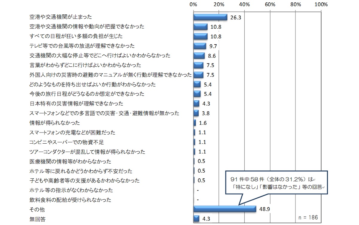 ・台風発生時に困ったことは「空港や交通機関が止まった」が26.3%とおよそ4人に1人が交通機関運休の影響を受けていた。一方で「特になし」「影響はなかった」等の回答も31.2%あった。