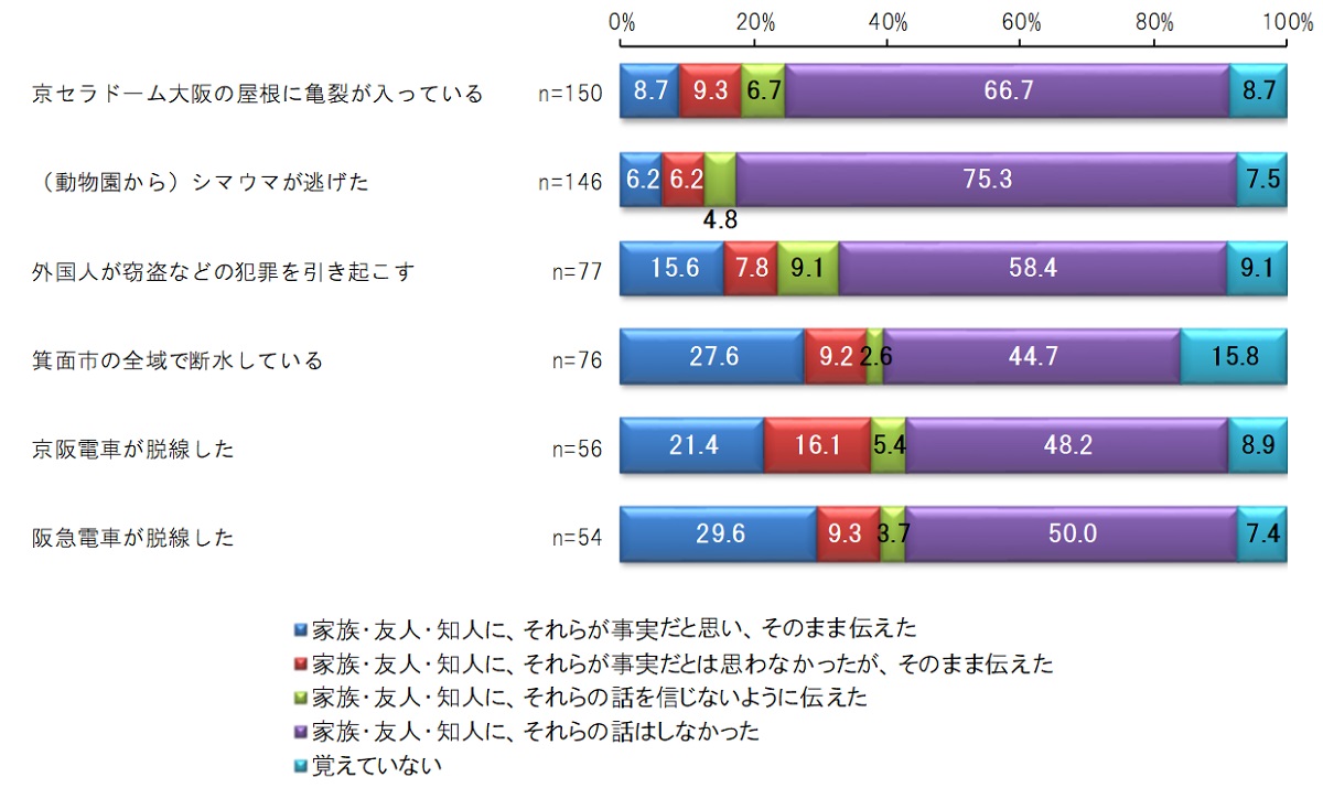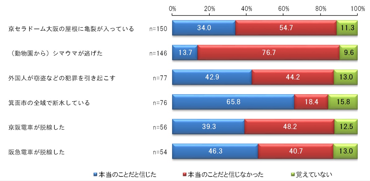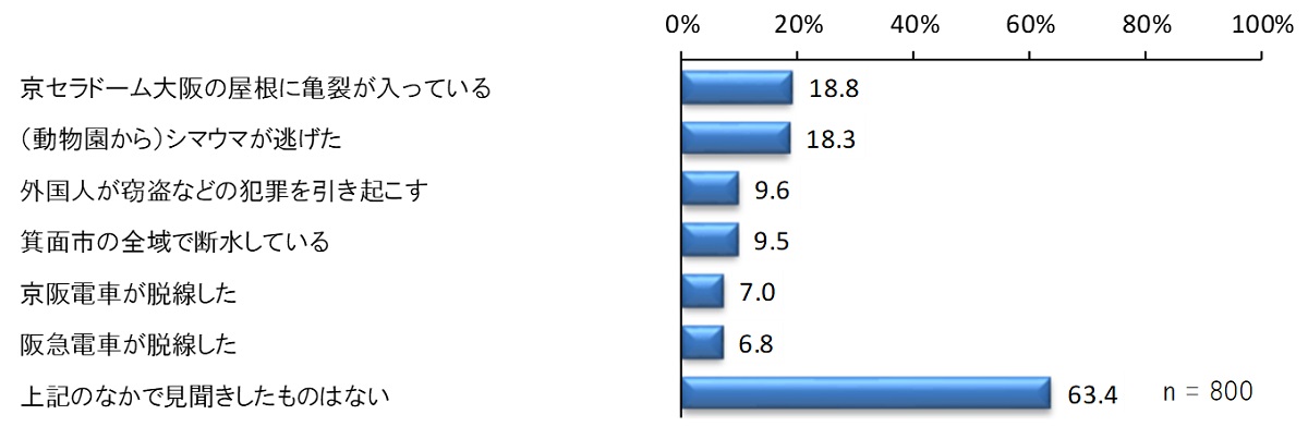 ・見聞きしたうわさ・流言の具体的な内容は、「京セラドーム大阪の屋根に亀裂が入っている」「(動物園から)シマウマが逃げた」などとなっている。