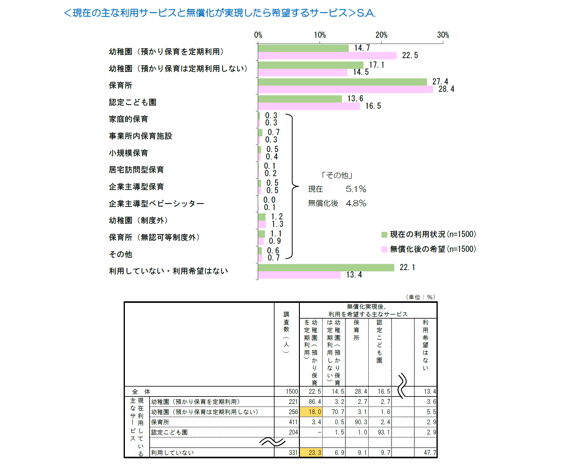 ・現在「幼稚園(預かり保育は定期利用しない)」人のうち「幼稚園(預かり保育を定期利用)」の利用希望者が18.0%、現在サービスを利用していない人の「幼稚園(預かり保育を定期利用)」の利用希望者が23.3%となっており、無償化実施後「幼稚園(預かり保育を定期利用)」の利用を希望する人が多い。