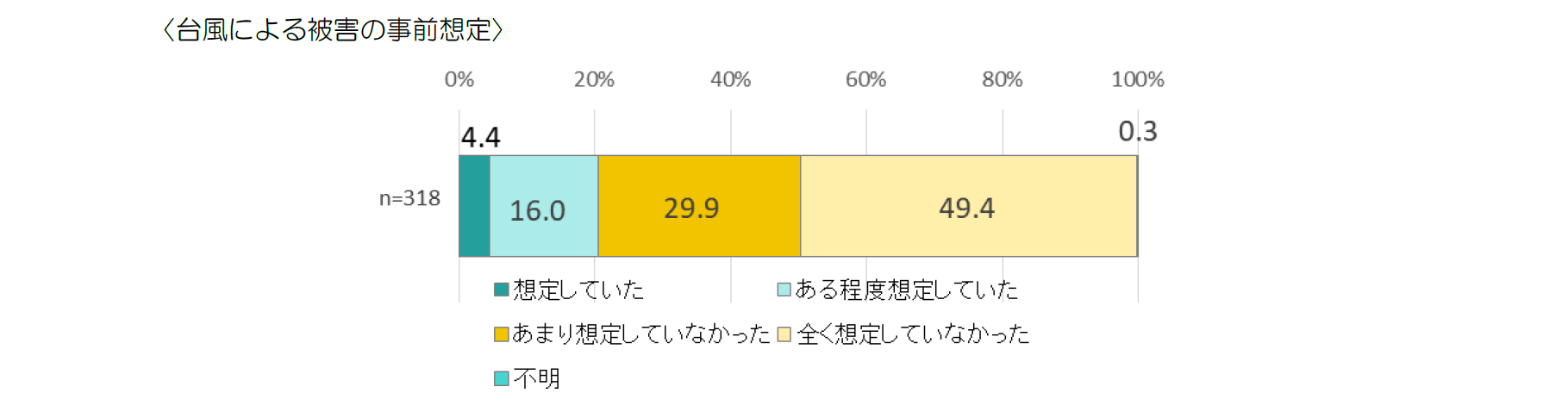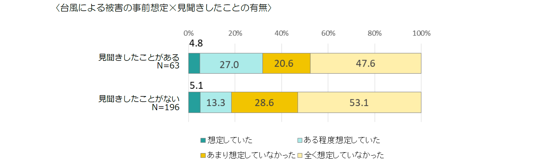 居住地域で、過去に台風や大雨による被害などについて見聞きしたことがある人とない人では、事前の想定に差がみられることがわかった。「想定していた」と「ある程度想定していた」を合わせた【事前想定層】は、見聞きしたことがある人の31.8%であり、見聞きしたことがない場合(18.4%)を約13 ポイント上回っている。