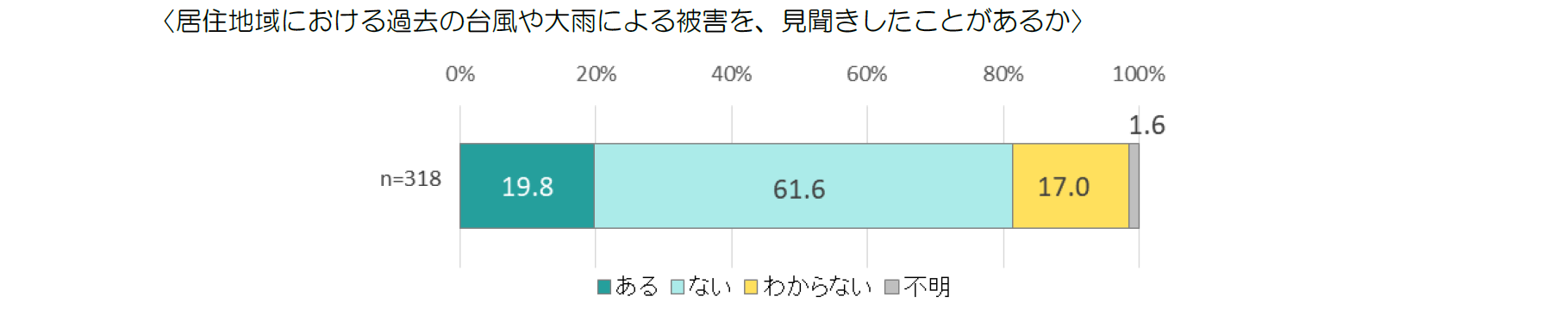 居住地域で、過去に台風や大雨による被害などについて、見聞きしたことがあるか、との問いに対しては、「ない」が61.6%となっている。