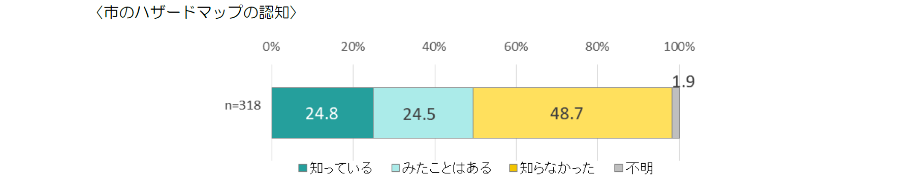 市が公表しているハザードマップについて、「知っている」と答えた人は24.8%で、内容はともかくマップがあることを知っている人と、知らない人がおよそ半数ずつとなっている。