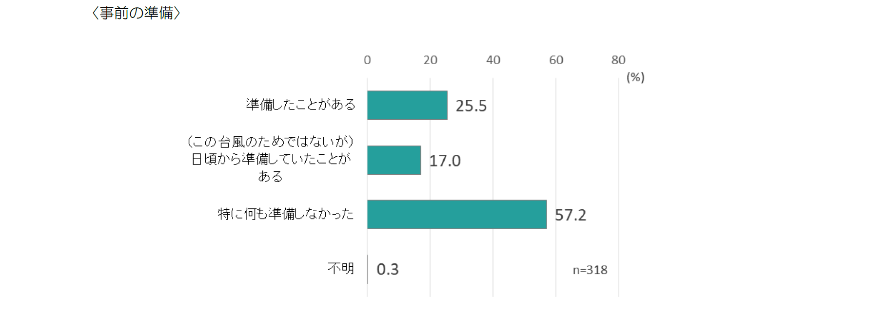 台風15 号に備えて、事前に準備をした人は、およそ4 人に1 人。今回の台風のためではないが日頃から行っていた準備を含めると42.5%が何らかの準備を行っているが、過半数は「特に何も準備しなかった」と回答している。
