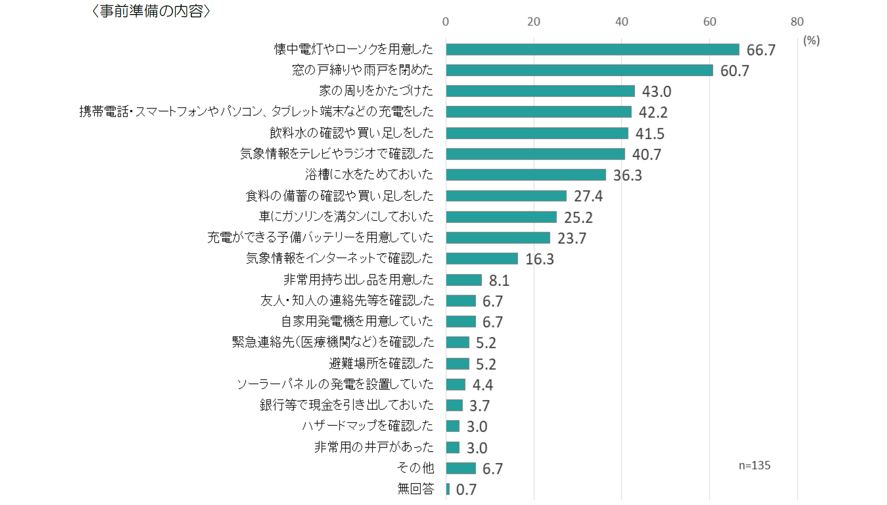 事前の準備行動では、「懐中電灯やローソクを用意した」(66.7%)、次いで「窓の戸締りや雨戸を閉めた」(60.7%)が特に多く、以下、家の周りのかたづけ、携帯電話・スマートフォンなどの充電、飲料水の確認や買い足しなどが上位となっている。