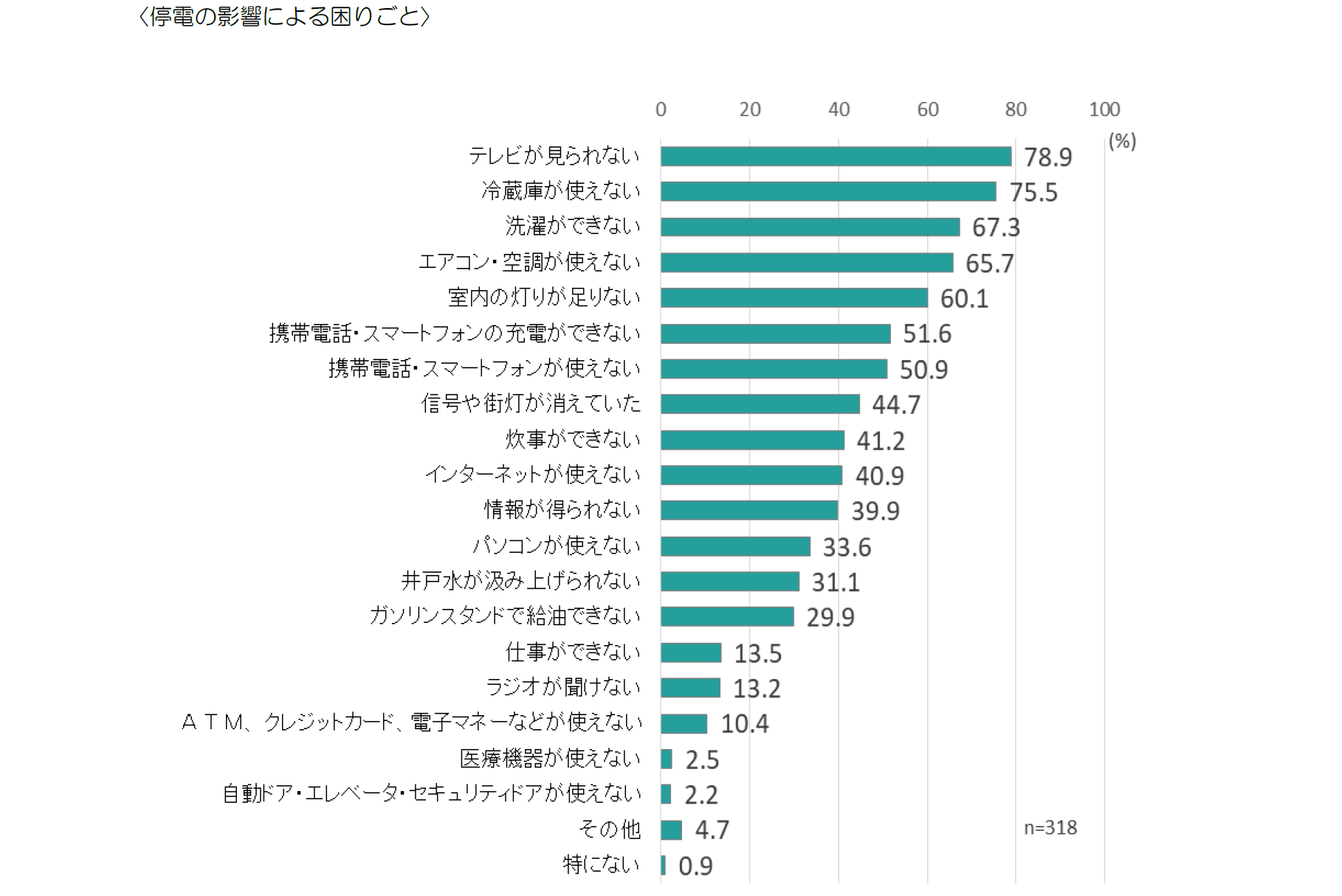 停電の影響により困ったことでは、「テレビが見られない」(78.9%)、「冷蔵庫が使えない」(75.5%)が特に多く、以下、となっている。