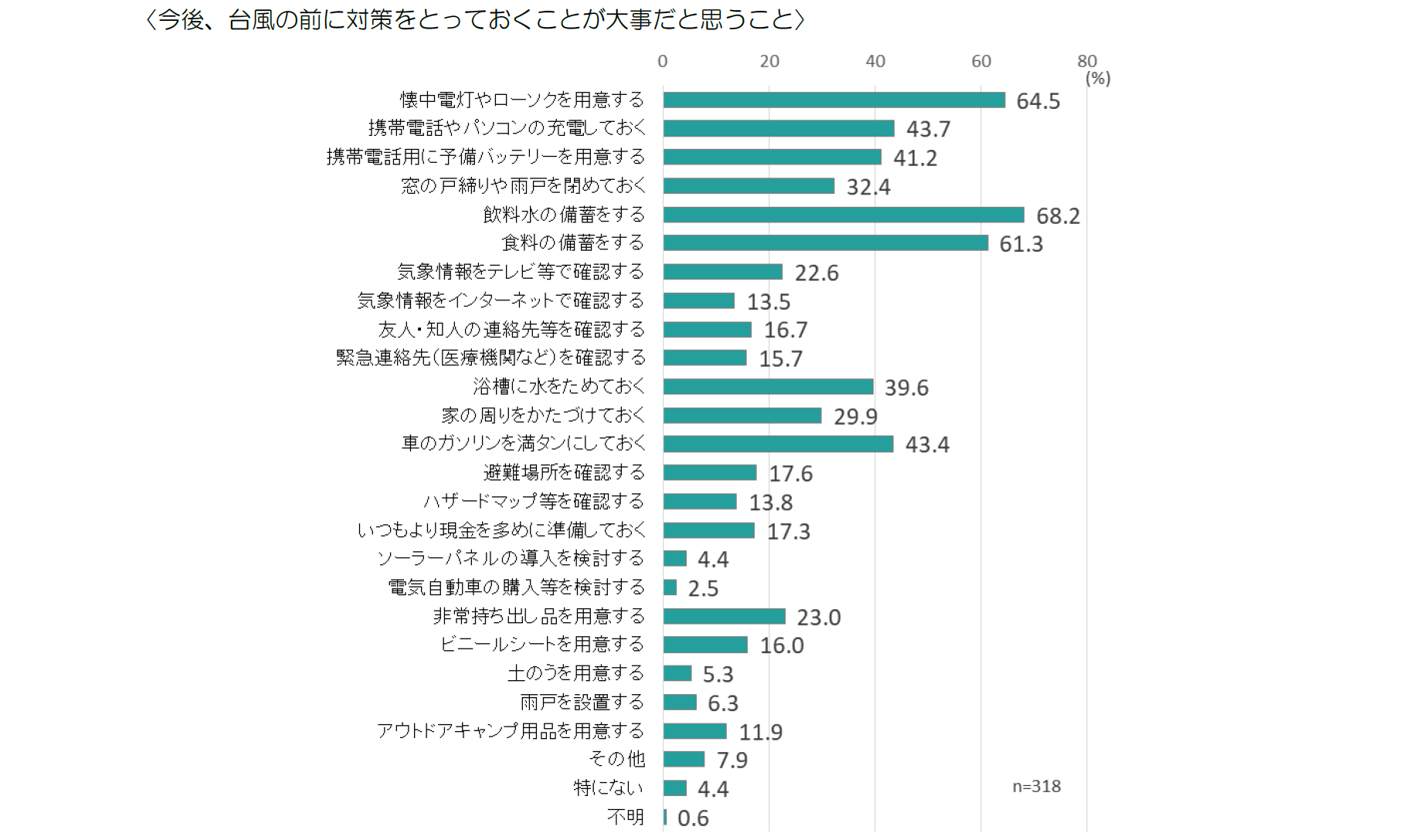 今回の台風を経験して、台風の前に対策をとっておくことが大事だと思うことをたずねたところ、「飲料水の準備をする」(68.2%)、「懐中電灯やローソクを用意する」(64.5%)、「食料の備蓄をする」(61.3%)が特に多かった。以下、携帯電話やパソコンの充電や予備バッテリーの用意、車のガソリンを満タンにしておくことや浴槽に水をためておくことなどの備えが上位にあがっている。