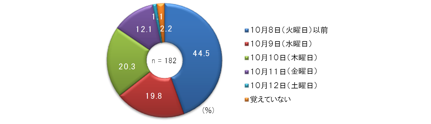 ・台風が来ることを知ったタイミングは、「10月8日以前」が44.5%、「10月9日」が19.8%、「10月10日」が20.3%、「10月11日」が12.1%と大半が台風上陸前に認知していた。
