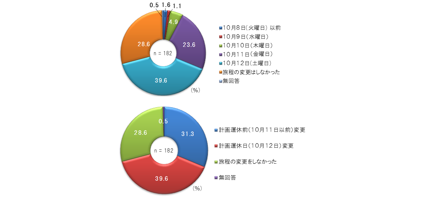 ・台風の影響で旅程を変更した人は、「計画運休前(10月11日以前)」が31.3%、「計画運休日(10月12日)」が39.6%。その一方で、「旅程の変更はしなかった」が28.6%となっており、台風に影響されず旅程を進める人達も見られた。