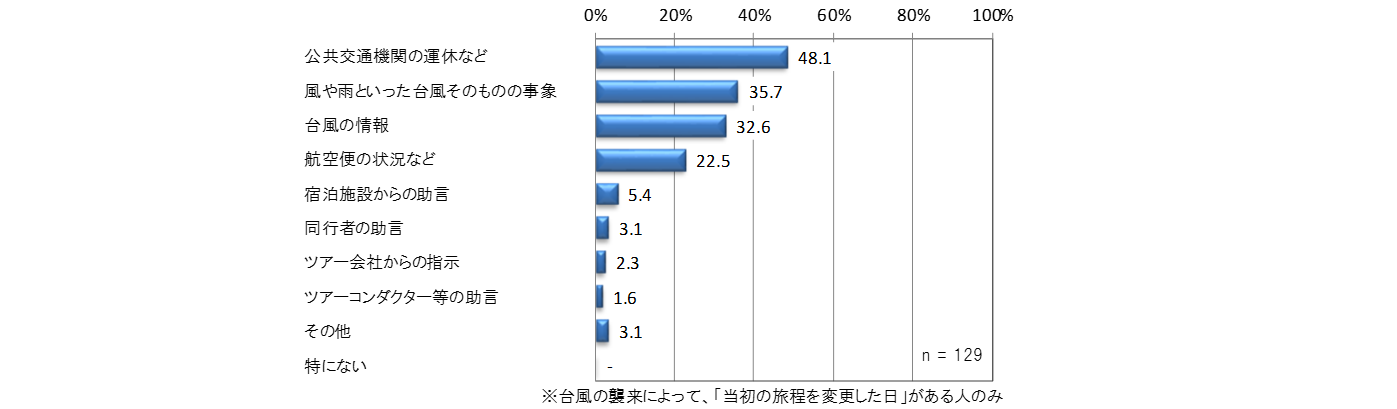 ・台風の襲来で旅程を最も変えたきっかけは、「公共交通機関の運休など」が48.1%と最も多く、