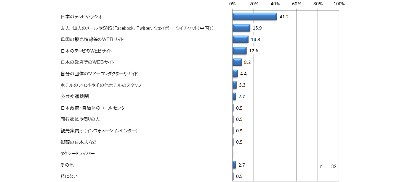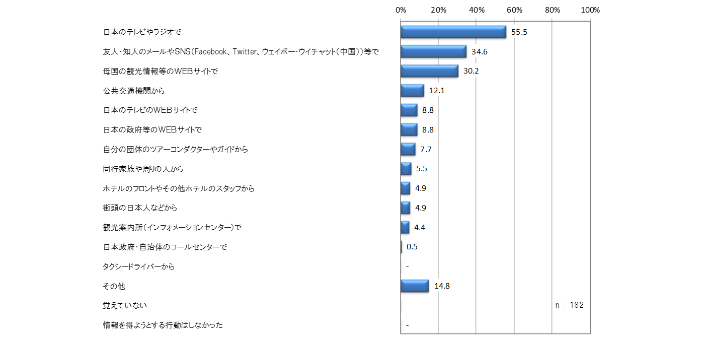 ・台風が来ることを知った情報媒体は、「日本のテレビやラジオで」が55.5%と最も多く、「友人・知人のメールやSNS等で」が34.6%、「母国の観光情報等のWEBサイトで」が30.2%等と続いている。