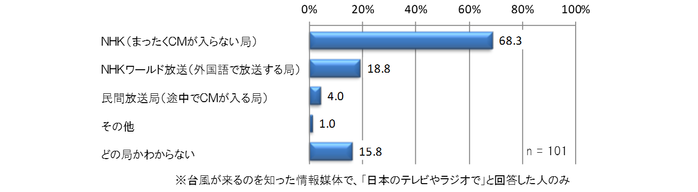 ・「日本のテレビやラジオ」で台風の情報を得た方に、具体的な放送局を聞いたところ、「NHK」が68.3%、「NHKワールド放送」が18.8%と続く。