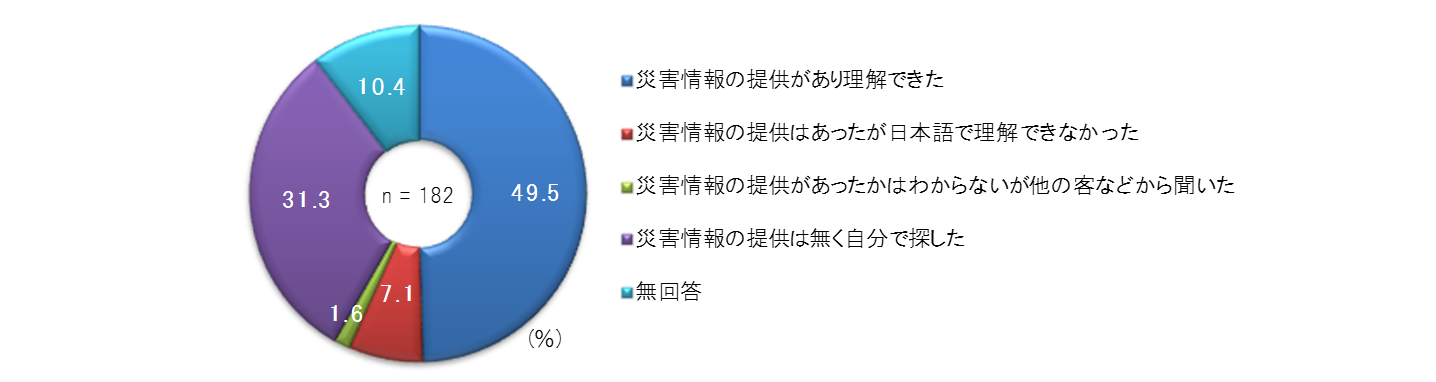 ・滞在していたホテルで「災害情報の提供があったか」また「理解できたか」は、「災害情報の提供があり理解が出来た」が49.5%であった一方、「災害情報の提供は無く自分で探した」が31.3%となった。