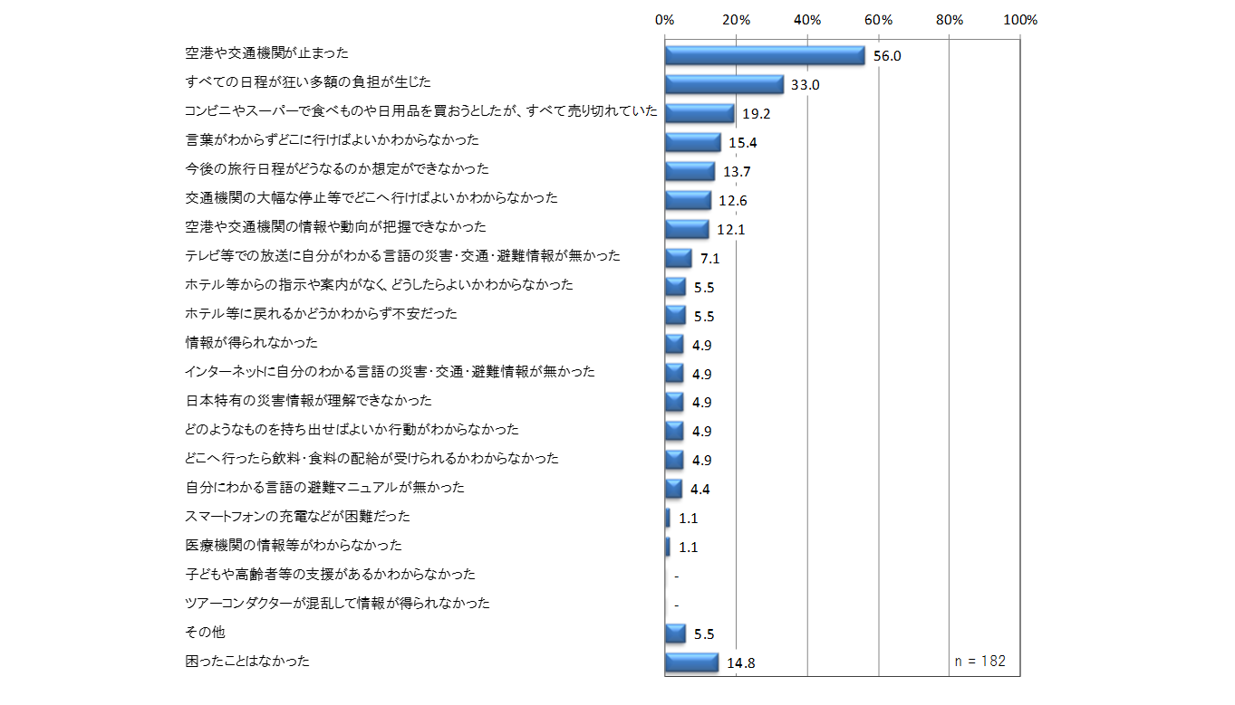 ・台風発生時に困ったことは「空港や交通機関が止まった」が56.0%と最も高かった。また、「すべての日程が狂い多額の負担が生じた」「今後の旅行日程がどうなるのか想定が出来なかった」などの日程に関する不安や、「コンビニやスーパーで食べものや日用品を買おうとしたが、すべて売り切れていた」「言葉がわからずどこに行けばよいかわからなかった」など台風発生前や発生時の行動についても影響を受けていることがみられる。
