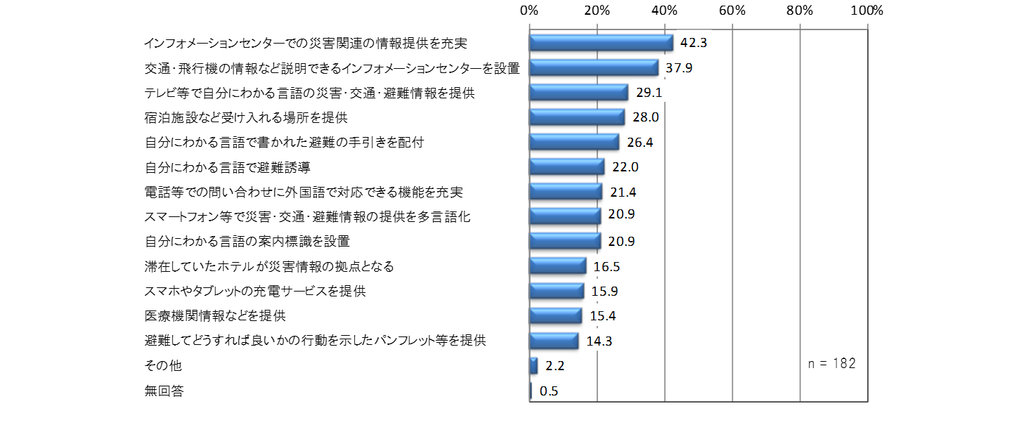 ・災害発生時に希望する対応は「インフォメーションセンターでの災害関連の情報提供を充実」が42.3%、「交通・飛行機の情報など説明できるインフォメーションセンターを設置」が37.9%と直接情報提供を受けることが出来る場所が求められている。