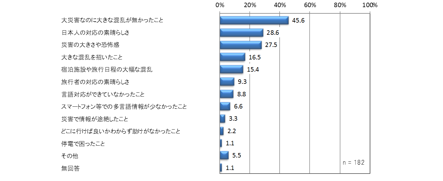 ・母国に帰った際に、今回の災害について話す内容としては、「大災害なのに大きな混乱がなかったこと」が45.6%、「日本人対応の素晴らしさ」が28.6%と、災害時の日本人の対応に関するものが上位にあげられた。