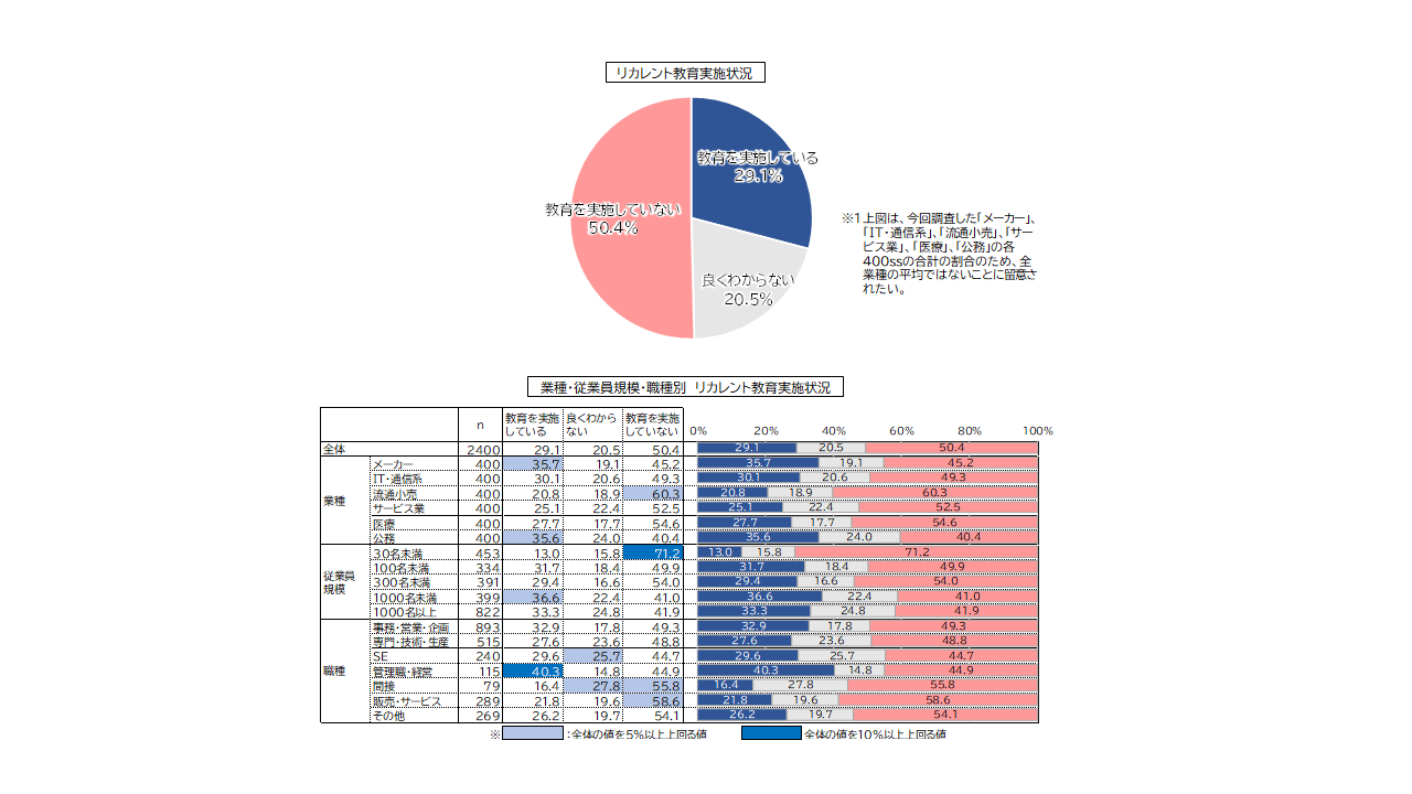 ・リカレント教育の実施状況は、全業種平均※1で29.1%が実施している。