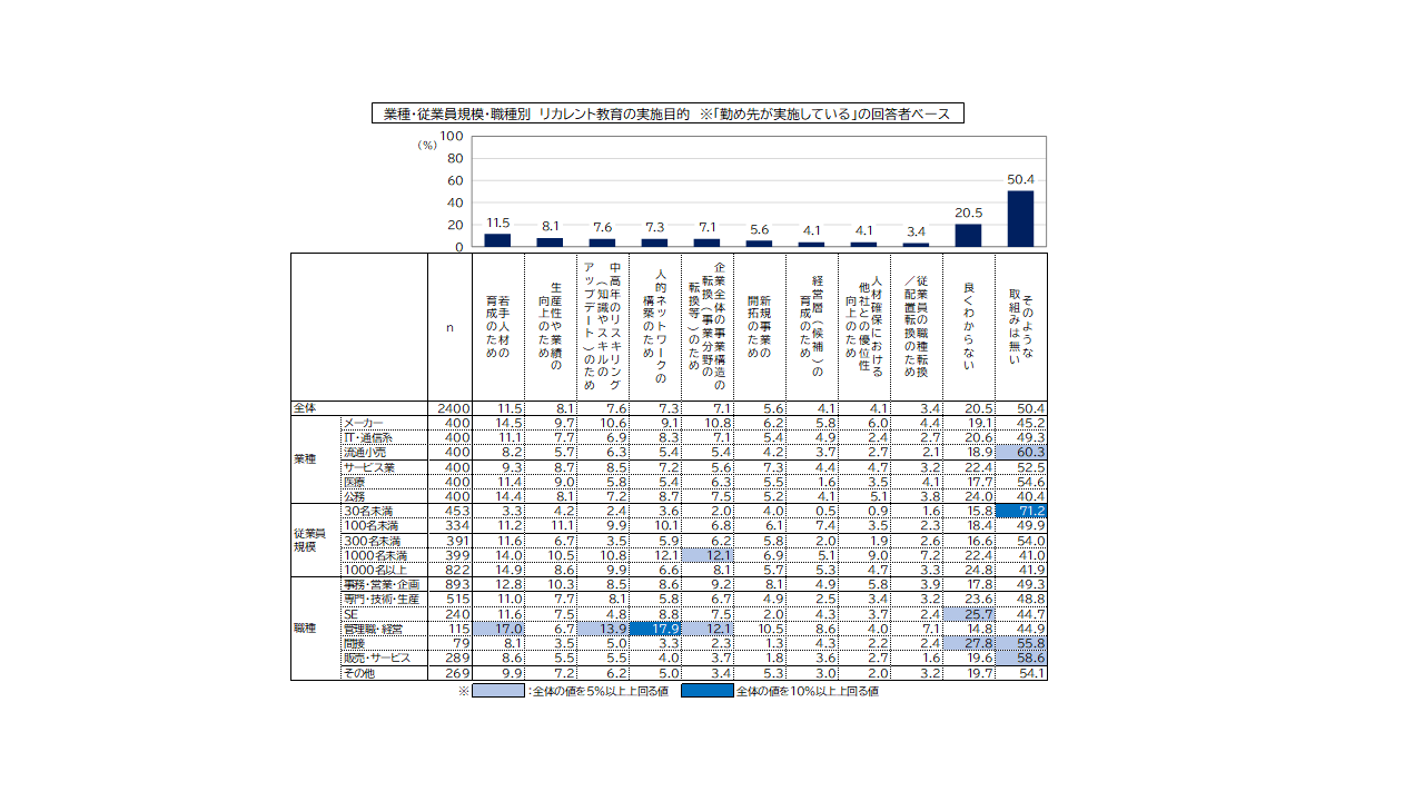 ・リカレント教育を実施する目的は、全業種平均では「若手人材の育成のため」が11.5%と最も高く、以下、「生産性や業績の向上のため」が8.1%、「中高年のリスキリング(知識やスキルのアップデート)のため」が7.6%、「人的ネットワークの構築のため」が7.3%と続いている。