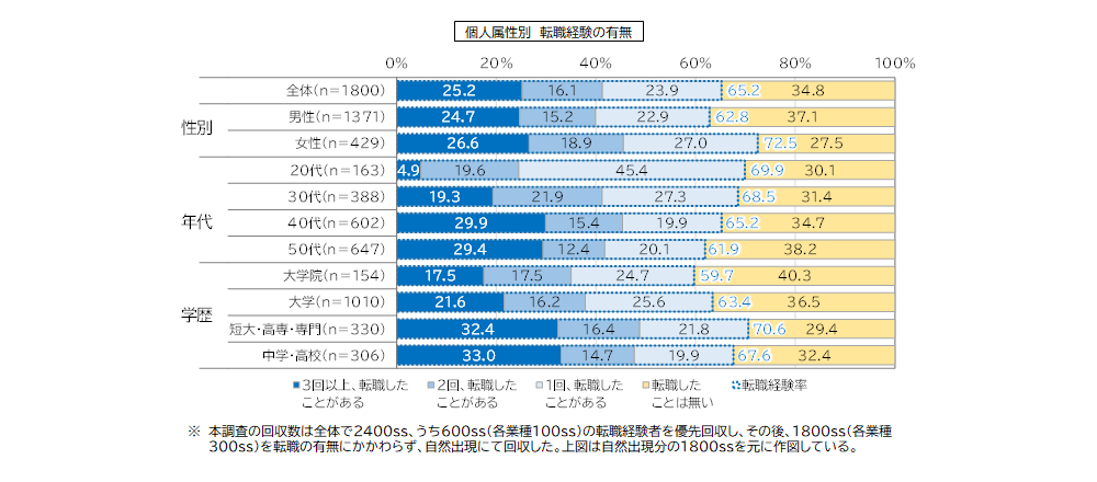 ・全体の転職経験率は65.2%となっており、概ね3人に2人は転職経験があった。