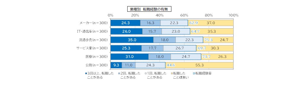 ・業種別では、「流通小売」や「医療」は転職経験者の割合が高く、転職回数も多い傾向があった。
