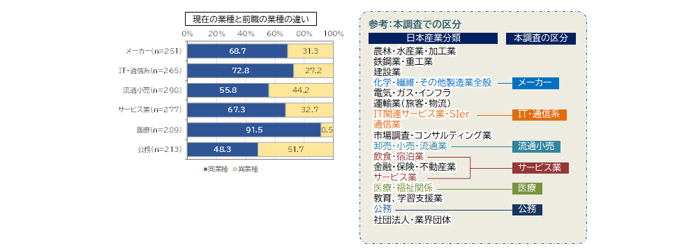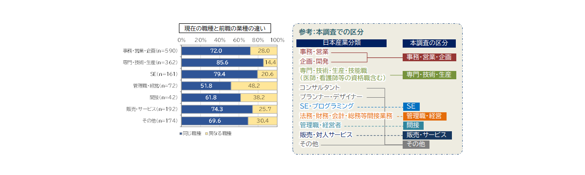 ・一方で、「専門・技術・生産」や「SE」、「販売・サービス」、「事務・営業・企画」は業種を変えない人の割合が高い。