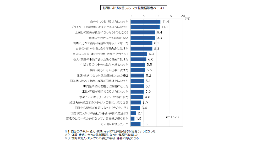 ・転職により改善したことは「自分らしく働けるようになった」が11.4%で最も高くなっている。