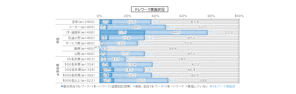 ・テレワーク実施率は全体で36.9%となっており、実施率が高いのは「IT・通信系」で77.2%、「医療」はエッセンシャルな職業でもあり比較的低く5.3%、同様に「サービス業」も27.2%となっている。